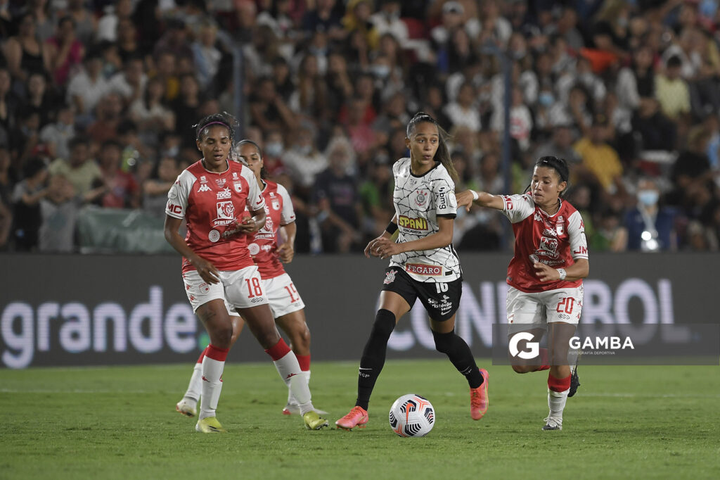 ©Sandro Pereyra-20211121SP_0586./ Kena Romero, de Independiente Santa Fé, Adriana, de Corinthians, Nairelis Gutiérrez, de Independiente Santa Fé, en el Estadio Gran Parque Central, el 21 de noviembre de 2021. / Foto: Sandro Pereyra, Gamba.-