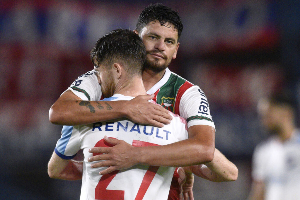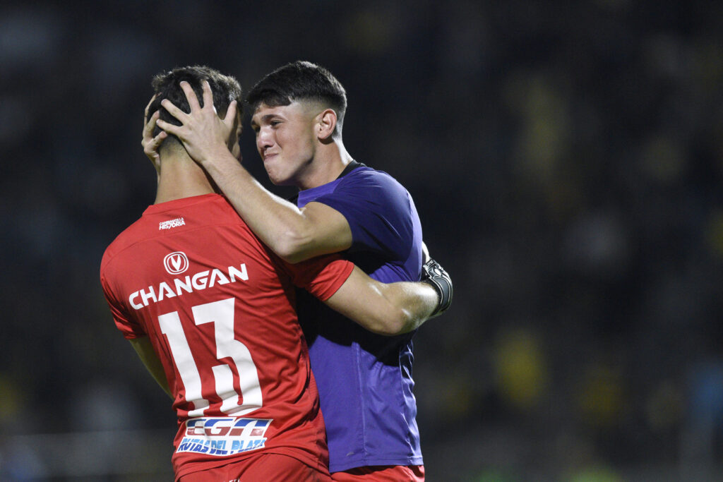 ©Fernando Morán-20220213FM-1728./ Matías Dufour y Angel Maciel, goleros de Defensor Sporting, al final del juego ante Peñarol el 13 de febrero de 2022 en el Estadio Campeón del Siglo. / Foto: Fernando Morán, Gamba.-
