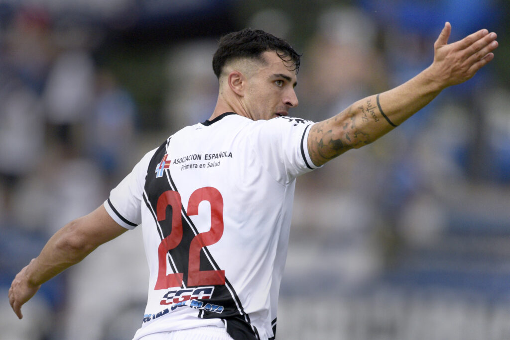 ©Fernando Morán-20220220FM-0440./ Mauro Méndez, de Wanderers, tras convertir ante Fénix el 20 de febrero de 2022, en el Parque Capurro. / Foto: Fernando Morán, Gamba.-